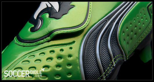 The central lacing system has been made easier to access with the introduction of a new lace-cover, probably the most striking feature. The lace-cover provides a unique look and is adorned with the Puma motif. Held down by an elastic strap and a TriHook fastener to ensure a snug fit and tighter fastening than the previous v1.10, the lace-cover offers a cleaner kicking surface.
