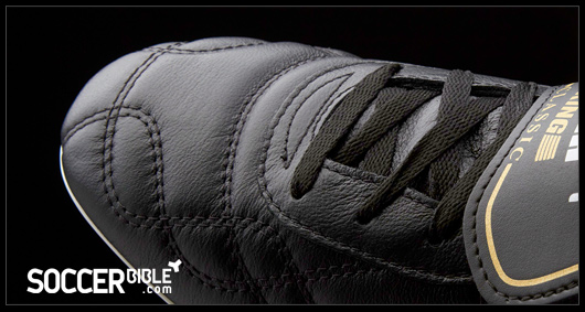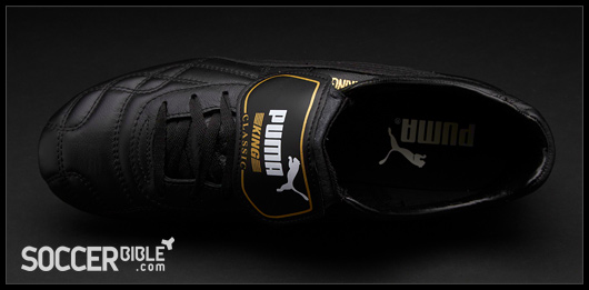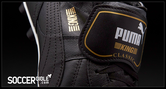 Classic style is provided through the traditional leather upper construction, and the Puma King Top remains one of the few boots to still feature the classic fold over tongue - an endangered feature in modern day football boots! Designed with a gold trim and the iconic Puma King logo which stand-out against the black background, the fold over tongue is a feature of a true heritage boot.