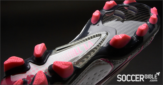 In addition, the new v1.11 soccer cleats enable greater playing stability, through an external heel counter and a Pebax frame that provides support to the outsole. The midfoot area is reinforced with a TPU composite which secures further stability and helps to avoid midfoot bending. This increased stability also enables an optimal traction as well as manoeuvrability, provided through the pointed stud configuration featured on this new boot.