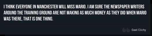 GC: Yes, I think everyone in Manchester will miss Mario. I am sure the newspaper writers around the training ground are not making as much money as they did when Mario was there, that is one thing. But he was a great guy and a lot of players really liked him, when we are in in London and when he decided to leave we said good-bye, I could tell it had a big impact on some of the players. So for sure we will miss him, but that is the way it is and tomorrow it could be another player, that is the way football is and we have to accept it.