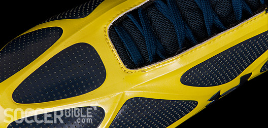 The boot upper, which is perforated to help with air-flow, is made from a synthetic material designed to be lightweight and responsive. The material is thin and cushioned throughout, and despite the boots exoskeletal frame, is soft to touch for good ball feel.
