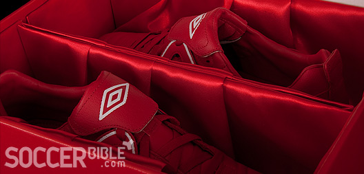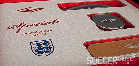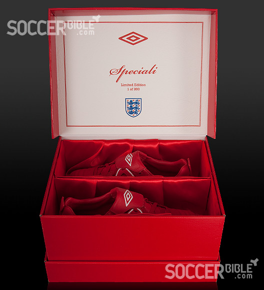 The limited edition England Red Umbro Speciali football boots are supplied with a classy and elaborate collectors box. The boots are individually placed into two fine silk compartments, with the official England crest and their unique pair number imprinted on the underside of the lid. And to protect and prolong the life of these special edition football boots, the compartment at the bottom reveals leather food, a brush and a shoe horn, once again presented with the official pair number and England crest.