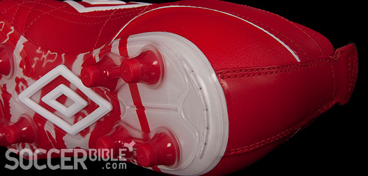 The outsole of the Umbro Speciali contributes to the the boot's performance, as the sole-plate flexes at the fore to improve acceleration and movement. And at the heel of the boot, the solid heel counter provides stability for the grounded foot when shooting and passing, as well as protection and support. Which combines with the unique 'A' frame design on both sides of the boots, to lock the solid heel counter into position and ensure a good fit.