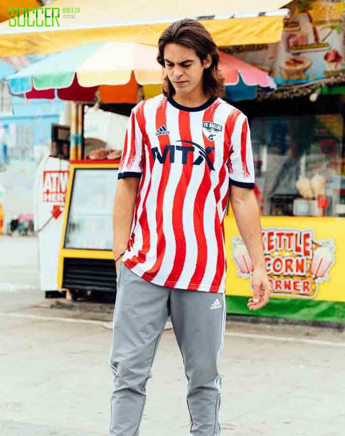 Americana系列主体是波浪形的红白竖条,这是’94 OG的设计造型,咋一看就是竖挂的美国国旗。跟阿迪达斯最近的艺术手法和手绘风格一致,红色竖条带有笔触效果。这是一个微妙的调整,带出了一种当代感,又不失其灵感来源的核心审美。袖口、衣领、胸前广告和赞助商商标的海军蓝配色是整件球衣的完美收笔。